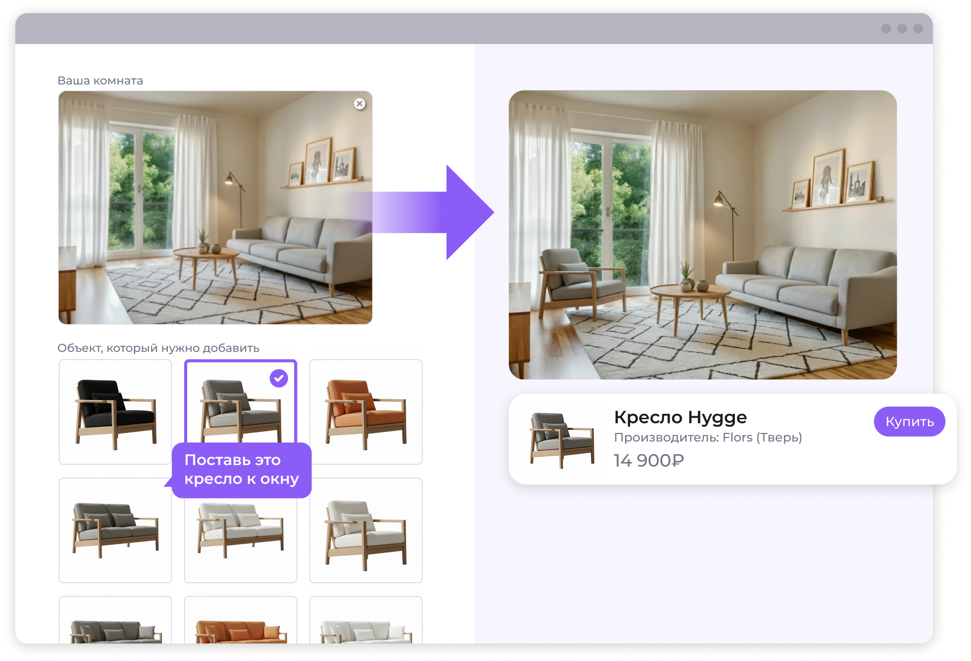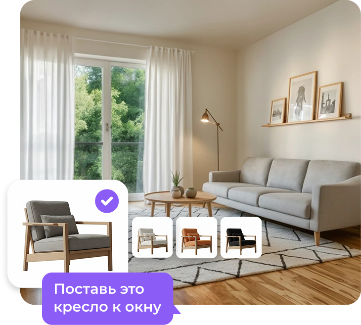 Для этого нужно сделать снимок комнаты и выбрать предмет из вашего каталога. Нейросеть сама подберёт ракурс и создаст визуализацию на уровне профессиональной 3D‑программы