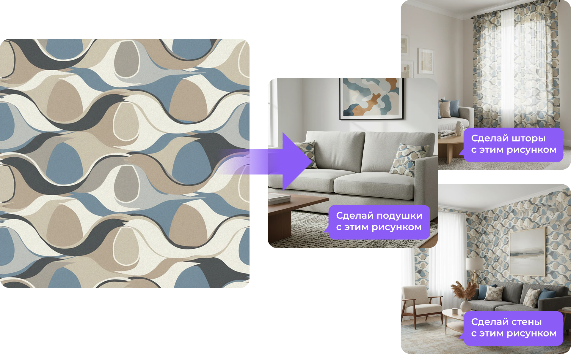 Клиент выбирает рисунок ваших тканей, плитки, обоев. Загружает своё фото и просит нейросеть примерить. Через несколько секунд получает фотореалистичную визуализацию своей квартиры.