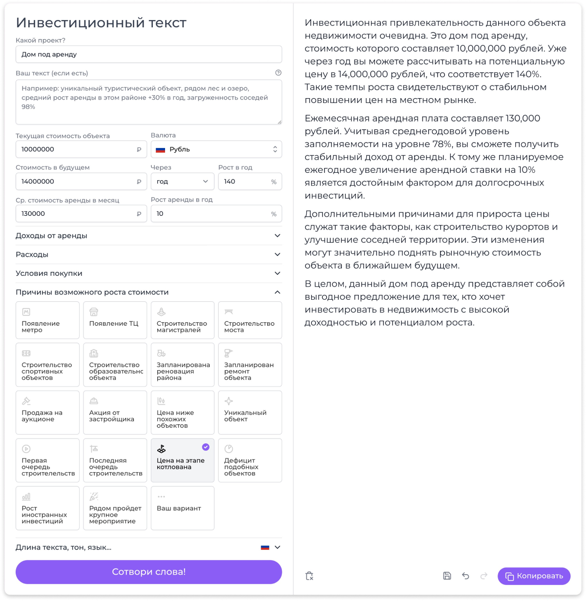 При работе с формой «Инвестиционный текст» вы можете заполнить до 60 полей на своё усмотрение. Отталкиваясь от заполненных данных, искусственный интеллект напишет текст, выделяющий все преимущества вашего проекта. Тратьте меньше времени на написание текста, а больше времени на работу с клиентами.