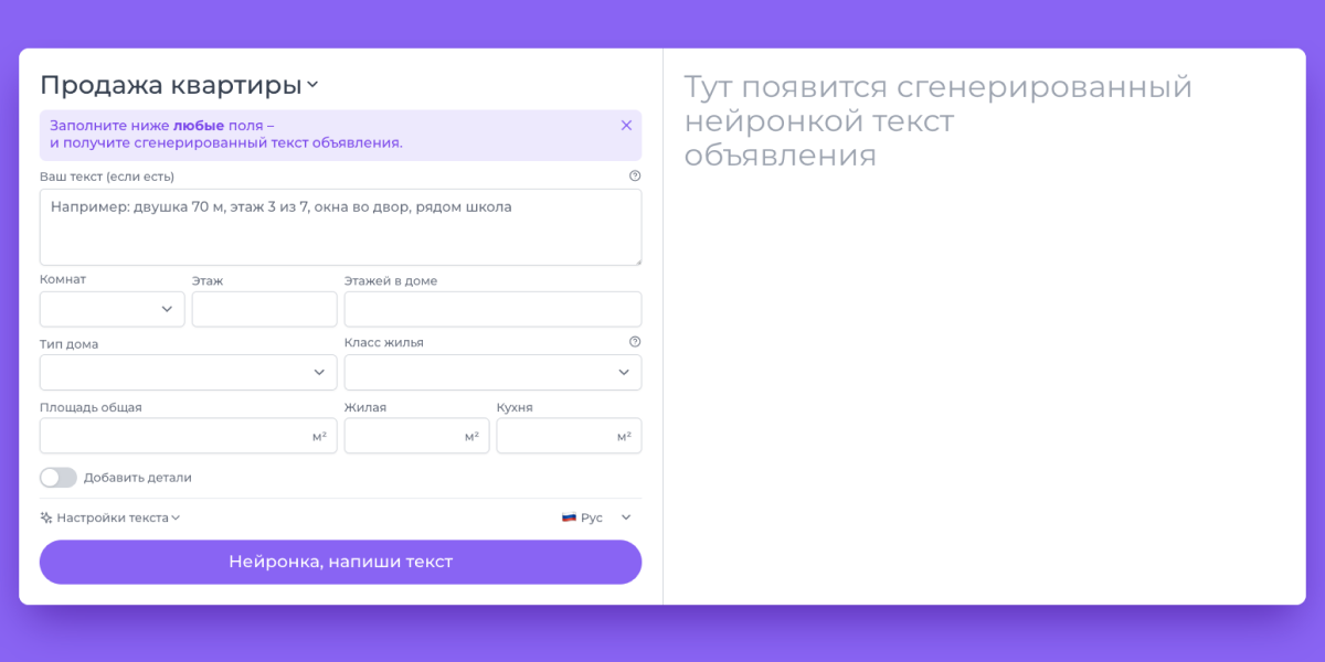 Заполните любые поля в форме и получите сгенерированные текст объявления от нейронки