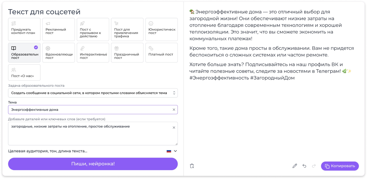 Добавьте тему и ключевые слова (если потребуется). Затем введите необходимую информацию, например, название объекта, основные характеристики и целевую аудиторию. Интерфейс сайта создан иллюстративно, внутри постановки промта много блоков с иконками для быстрого выбора нужных опций. Мы специально разрабатывали дизайн, который будет понятен всем и позволит быстро решать рабочие задачи. Забирайте готовый текст или редактируйте его прямо в окне ответа.